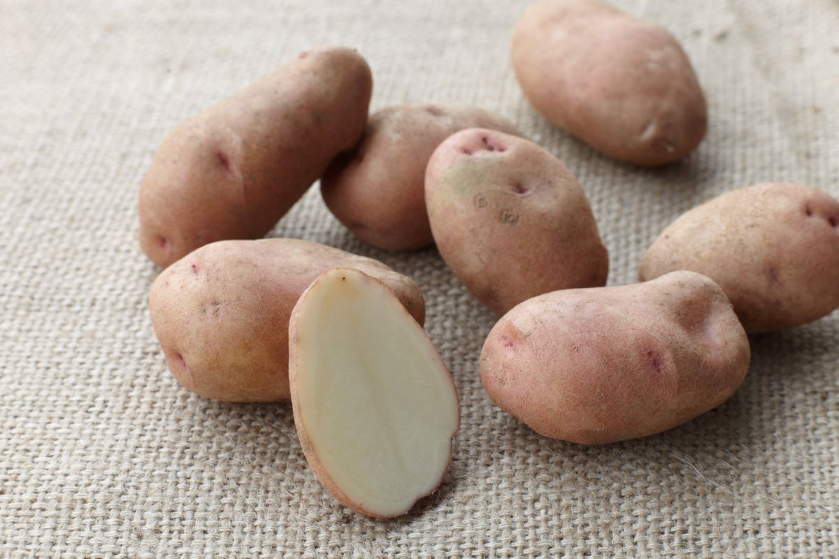 Rund-ovale Knolle mit hellroter Schale und weißem Knollenfleisch