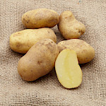 Längliche Knollen mit gelbem Knollenfleisch und flachen, roten Augen