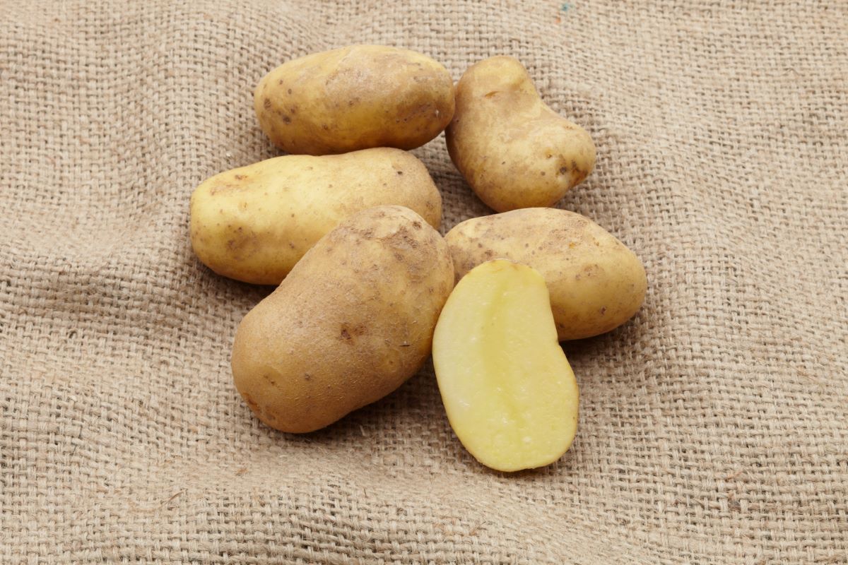 Längliche Knollen mit gelbem Knollenfleisch und flachen, roten Augen